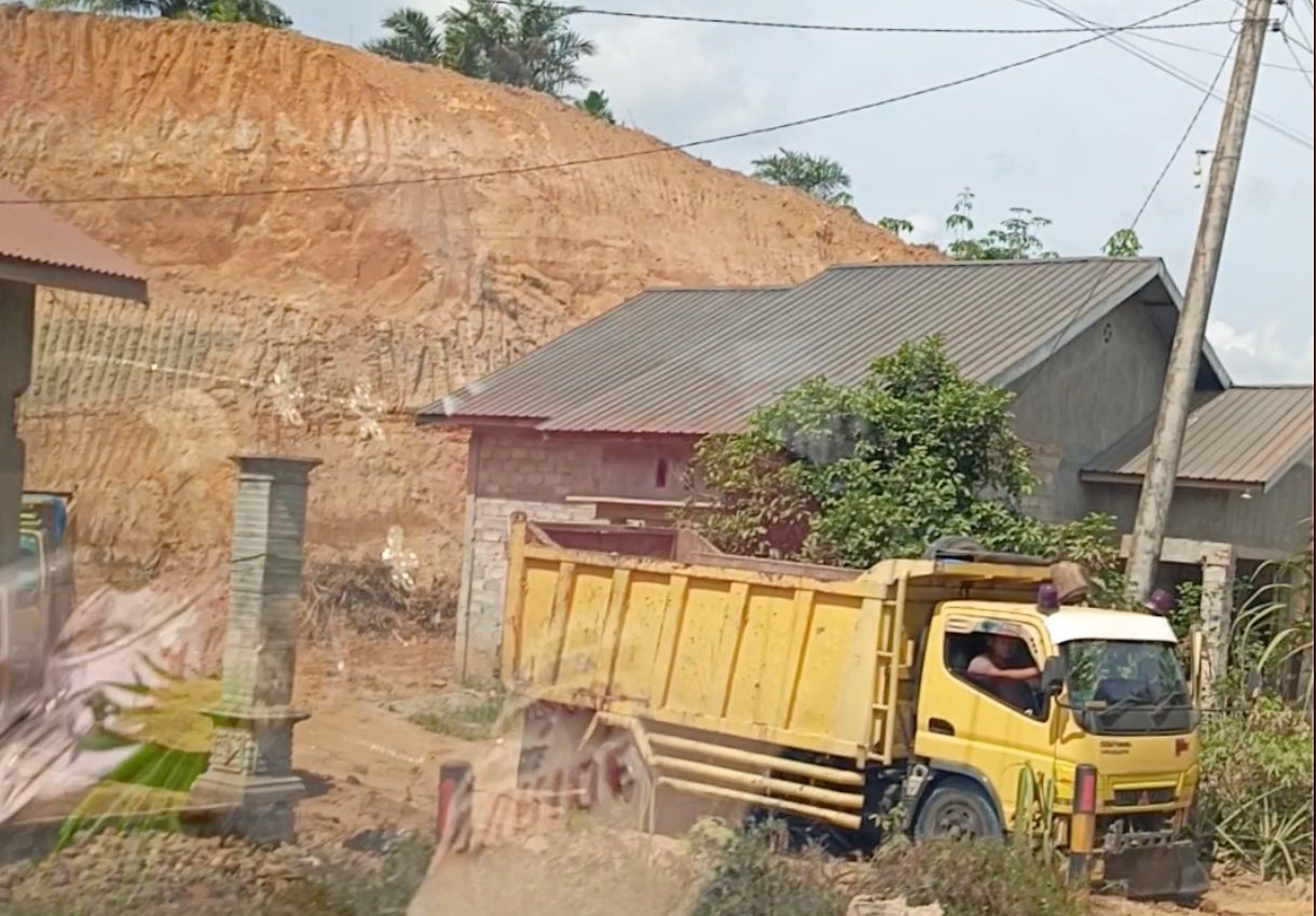 Pantauan awak media, terlihat alat berat jenis excavator sedang mengeruk diding bukit di sana. Truk-truk bergiliran antre untuk memuat tanah urug, persis di tepi Jalan Raya Batang Serangan.